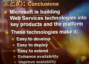 図の右と左の世界の中で大きく変わるものがある。これは多分DOSからWindowsに変わった時に匹敵する変革である。Windowsから.NETのプラットフォームに変わったとき、各々のブロックの中が、例えば、パソコンだけでなくパソコンと他のデバイスが存在する、Win32のAPIだけでなくBuilding Blockを中心に、File SystemからXML Storeへ、User InterfaceからUser Experienceへ、また各種アプリケーションからサービスに変わっている。これについてForum2000でのビル・ゲイツの話をお聞きいただきたい。このお話について詳細な解説がありました。 私どもはこれから先にはマイクロソフトのアプリケーション、パートナー様のアプリケーションなしに、私どもはサービスを提供し、そして皆様のパートナーの方々にもサービスを提供していただくために必要なものをご用意していく形となる。 また、途中で寝てしまった人に対するコメントとして、「Windowsは止めません」、「Windowsのアプリケーションをそのまま書いていただくことが必ず.NETのプラットフォームに一応つなぐことになるのでそこに不安を持っていただくことは止めていただきたい。」とのお断りがありました。 ●What is Microsoft .NET マイクロソフトがどうして、.NETに取り組んだかについて、次の項目について実際に事例をいれた詳細な説明が行われました。 『次世代Internet Platformの開発/提供』・・・「新しいUser Experienceの提供」、「次世代インターネットに適したサーバー群の開発/提供」、「プログラミングモデルの提案、開発環境の整備」、「ビルディングブロックとしてのサービスの整備」、「Non-PCデバイスも視野に入れたプラットフォームの提供」。 『アプリケーションサービスの提供』・・・「MSN.NET」、「Personal Subscription Service」、「Office.NET」、「bCentral for .NET」、「Visual Studio.NET」。 ●.NETビジネス体験 例としてビデオによる大変面白い例が紹介されました。