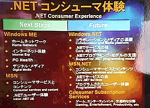 これから先、ナチュラルインターフェイスというのは言葉を理解したり、視覚をより有効に活用したりするということがどんどん進んでいくと思う。今の見ていただいたビルの顔の技術はMicrosoft Researchの中で開発されたコンポーネントで、実際にこのコンポーネントの一部分がExcel、Wordの中で既に使われアニメーションへの対応をしている。これから先の新しいインターネットの体験の中ではどんどん新しいインターフェイスが出てくるであろう、それらを自由に活用していくことができる場にしていきたいと思う。 ●MSN .NET体験 家庭の場合、コンシューマの世界ではこれから先にMSNをアクセスしてホームページを見る場合こんなふうに変わるでしょう、というデモがモバイル、デジタルTV、ホームPCについてありました。.NET Experienceのモバイルの場合では、旅行の計画を立てたとき、動物園、ホテル、レストランの予約から留守になる自宅のセキュリティの管理、もし空席があり日程が変更になったときはメンバーのスケジュールに連動してチェック・連絡など全てホームページ側でやってくれる。また、モバイルデバイスを持ってある物に近づいただけでそこに関連した情報が全部映る、自分自身のロケーションサービスで自分がどこにいるかというロケーションが分かる。今は徘徊老人だとか、盗まれたバイクをトレースする位であるが、これからは重要な使い道となり、一例として一番近いプリンターへの出力サービスなどができる。また、.NET ExperienceのデジタルTVの場合では、有料で写真の額縁サービスができる例が示されました。こんなことが簡単にできるようになった一つの理由は、画面に映っているそのものがXMLで書かれているからであり、これから先にはXMLの世界は有効に活用されていくことだろう。 ●.NETコンシューマ体験 デスクトップのパソコンだけでなく新しいデバイスとしてタブレットPCなどを含めて新しい環境が整ってきた。実際には新しいインターフェイスの中でここではペンを使ってやっているが、重要なことはメニューの形態が変わるとか見栄えがよくなるということではなくて、その中で仕組まれている情報そのものが、サービスそのものがお互いXMLで連動することによって新しい環境が生れてくるということが重要なことである。この中でパソコンの果たす役割が少しずつ変わってくると思う。生産性の分野で、創造性の分野で、コミュニケーションを司る、エンターティンメントの分野で、ショッピングセンターとしての電子商取引で、あらゆる分野の中でパソコンそれなりの役割を果たしてくるだろう。 .NETプラットフォームの上に、MSN.NET(プログラムされたお客様の体験)とコンシューマの購読サービス(娯楽ゲーム、生産性活動などの付加価値サービス)が存在することになる。.NETコンシューマ体験のNext StepとFutureは次の図のようになる。
