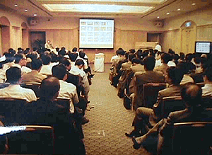 恒例となりました納涼技術者交流会での古川様のセミナーは、今回も2時間以上にわたり、「次世代のインターネット Microsoft .NET」の全体像とコンシューマ向け戦略についてお話いただきました。100枚近くのスライドにビデオ映像を取り込みながらデモを交えてのお話しは、いつものように出席者を飽きさせることなく圧倒し、懇親会の始まりを20分近く延ばすことにより終了しました。なお、司会は下川副会長により行われました。