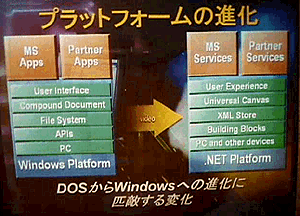 ●デジタルワールドへ 世の中が今いろいろな物がデジタル化している。パソコンの周りの出来事を見てみると写真のデジタルの出荷数量が今年ついにフイルムの出荷数量を超えた。出荷台数だけでなく実際それから吐き出される紙の量といったものも印画紙のスペースより実際プリクラやカラープリンターで出力される面積の方が多くなった。そうやって見てくると写真の世界はデジタルカメラとパソコンの関係はお互いに協調し合いながら一定のところまで到着したものだと思う。また、今年から来年にかけて音楽を自由に編集したり、音楽を自由に持ち歩いたりといった新しいミュージックデバイスの登場、ネットワークで音楽を聴くといった状況が新しく生れてくると思う。そして、Windows Meの登場によりビデオがパソコンの中で自由に編集ができることになる。このようにデジタル化されたメディアがパソコンの中で非常にいいものになるという状況になってきている。従来、マルチメディア系もしくは新しいメディアの流れというと音が出て絵が出るということを中心に考えてきたが、今回の.NETの発表の中、それから.NETを対象にしたコンシューマデバイスの中でもう一度手書きの文字で自由にノートを取るといったペンを使って操作するようなインターフェイス、それから書籍そのもののメディアとして新たな流れを作るであろうという意味においてノートがデジタルメディアとして登場するものと思われる。 そういったメディアのビジネスの分野では、インターネット/イントラネットの単にホームページを掲示してその中で実際にドッジボールのやりとりというレベルを超えて、インターネットの時代では購買/販売、契約、サービス、記録といった分野で各々のインターネットの力が既に使われ始めているのではないかと思う。従来、知的ワーカーの方々にとっては印刷物を配布する、回覧するという形での情報の共有、そして1対1の間でメールのやり取りをしていたような情報の共有の仕方が、相互の中の情報を如何に共有して、良い情報も悪い情報も速やかに判断して、かつ方向を決めていくかという中での情報の分析、会議の持ち方、学習の仕方といったことに関して各々デジタル化がどんどん進んでいくのだと思う。 ●次世代のインターネット マイクロソフトは、1975年創業時「全ての机に家庭にコンピュータを」というビジョンを掲げ、プラットフォームはパソコンというハードウエアであってその上にソフトウエアとしての基盤としてBASIC、MS-DOS、Windowsを乗せた上で私どもは今までやってきた。 ところが昨年から方向を変えて新しいビジョン「時や場所、機器を問わず、優れたソフトウエアで人々の可能性を広げる」を掲げた。この言葉の持つ意味というのは、物が欲しい時代からソフトウエアを通じて人々の力になるためには単にソフトウエアを運用しているだけではなくて時や場所、機器を問わずにソフトウエアが自由に発揮できるような環境を作っていきたい。ここで新しい定義をしたいのは、従来ソフトウエアと呼んでいるものはプログラムとそれを運用されるコンテンツなどが中心になっていたが、これから先にソフトウエアそのものは、ネットワークの中で運用されるあらゆる形のサービスを実現することが要求されてくるのではないかと思う。その時に、私どもは今までのハードウエアがあってその上にOSを乗せるといったプラットフォームから、インターネットの上に基盤を築いてきたい、そして中核となるソフトウエアの基本アーキテクチャとして.NETをこれから提案していきたいと思う。その中でキーワードとしてサービスとしてのソフトウエア、それを実現する新しい時代の新しいスマートなデバイス、そしてあらゆるところにおいてXMLに柔軟に対応していく(XMLを中核に据え置いてそこから上がってくるメッセージをどういう形で処理するか、XMLを核にどういう形で情報を格納するか)ということを中心に考えて展開していきたいと思う。そしてこれからは、今までのユーザーインターフェイス(ファンクションを中心にしたもの)から、新しいユーザー体験(New User Experience)を中心にして考えていきたいと思う。ユーザー体験とは、1つの時間の流れの中で企業として価値ある時間を過ごしたのだろうか、生産性が上がったのだろうか、そして個人として豊かな時間が過ごせたのだろうか、ということを保証していくことである。 ●Forum2000(6月22日に開催)でのビル・ゲイツの発言 サービスそのものが各クライアントに奉仕できる。今までの積み上げ方がハードの基盤の上に積みあがったOSその上にアプリケーションが存在していたのではなしに、サービスを中心にそれに必要ないくつかのコンポーネントを自動的に立ち上げてきてお客さんに奉仕していきたい、そんな環境を作っていきたい。個人だけで起こしているのではなくて、他のXMLのコンポーネントに対しお互いにやり取りするというような