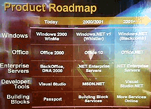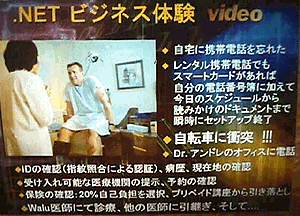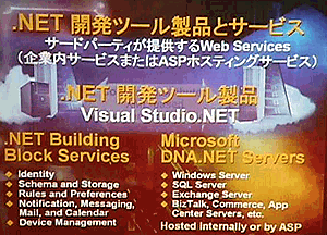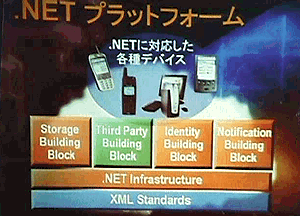 図の右と左の世界の中で大きく変わるものがある。これは多分DOSからWindowsに変わった時に匹敵する変革である。Windowsから.NETのプラットフォームに変わったとき、各々のブロックの中が、例えば、パソコンだけでなくパソコンと他のデバイスが存在する、Win32のAPIだけでなくBuilding Blockを中心に、File SystemからXML Storeへ、User InterfaceからUser Experienceへ、また各種アプリケーションからサービスに変わっている。これについてForum2000でのビル・ゲイツの話をお聞きいただきたい。このお話について詳細な解説がありました。 私どもはこれから先にはマイクロソフトのアプリケーション、パートナー様のアプリケーションなしに、私どもはサービスを提供し、そして皆様のパートナーの方々にもサービスを提供していただくために必要なものをご用意していく形となる。 また、途中で寝てしまった人に対するコメントとして、「Windowsは止めません」、「Windowsのアプリケーションをそのまま書いていただくことが必ず.NETのプラットフォームに一応つなぐことになるのでそこに不安を持っていただくことは止めていただきたい。」とのお断りがありました。 ●What is Microsoft .NET マイクロソフトがどうして、.NETに取り組んだかについて、次の項目について実際に事例をいれた詳細な説明が行われました。 『次世代Internet Platformの開発/提供』・・・「新しいUser Experienceの提供」、「次世代インターネットに適したサーバー群の開発/提供」、「プログラミングモデルの提案、開発環境の整備」、「ビルディングブロックとしてのサービスの整備」、「Non-PCデバイスも視野に入れたプラットフォームの提供」。 『アプリケーションサービスの提供』・・・「MSN.NET」、「Personal Subscription Service」、「Office.NET」、「bCentral for .NET」、「Visual Studio.NET」。 ●.NETビジネス体験 例としてビデオによる大変面白い例が紹介されました。