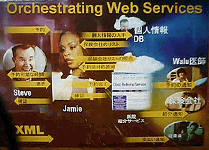 これから先、ナチュラルインターフェイスというのは言葉を理解したり、視覚をより有効に活用したりするということがどんどん進んでいくと思う。今の見ていただいたビルの顔の技術はMicrosoft Researchの中で開発されたコンポーネントで、実際にこのコンポーネントの一部分がExcel、Wordの中で既に使われアニメーションへの対応をしている。これから先の新しいインターネットの体験の中ではどんどん新しいインターフェイスが出てくるであろう、それらを自由に活用していくことができる場にしていきたいと思う。 ●MSN .NET体験 家庭の場合、コンシューマの世界ではこれから先にMSNをアクセスしてホームページを見る場合こんなふうに変わるでしょう、というデモがモバイル、デジタルTV、ホームPCについてありました。.NET Experienceのモバイルの場合では、旅行の計画を立てたとき、動物園、ホテル、レストランの予約から留守になる自宅のセキュリティの管理、もし空席があり日程が変更になったときはメンバーのスケジュールに連動してチェック・連絡など全てホームページ側でやってくれる。また、モバイルデバイスを持ってある物に近づいただけでそこに関連した情報が全部映る、自分自身のロケーションサービスで自分がどこにいるかというロケーションが分かる。今は徘徊老人だとか、盗まれたバイクをトレースする位であるが、これからは重要な使い道となり、一例として一番近いプリンターへの出力サービスなどができる。また、.NET ExperienceのデジタルTVの場合では、有料で写真の額縁サービスができる例が示されました。こんなことが簡単にできるようになった一つの理由は、画面に映っているそのものがXMLで書かれているからであり、これから先にはXMLの世界は有効に活用されていくことだろう。 ●.NETコンシューマ体験 デスクトップのパソコンだけでなく新しいデバイスとしてタブレットPCなどを含めて新しい環境が整ってきた。実際には新しいインターフェイスの中でここではペンを使ってやっているが、重要なことはメニューの形態が変わるとか見栄えがよくなるということではなくて、その中で仕組まれている情報そのものが、サービスそのものがお互いXMLで連動することによって新しい環境が生れてくるということが重要なことである。この中でパソコンの果たす役割が少しずつ変わってくると思う。生産性の分野で、創造性の分野で、コミュニケーションを司る、エンターティンメントの分野で、ショッピングセンターとしての電子商取引で、あらゆる分野の中でパソコンそれなりの役割を果たしてくるだろう。 .NETプラットフォームの上に、MSN.NET(プログラムされたお客様の体験)とコンシューマの購読サービス(娯楽ゲーム、生産性活動などの付加価値サービス)が存在することになる。.NETコンシューマ体験のNext StepとFutureは次の図のようになる。