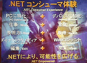 後半の『.NET for Consumer』では、「人々の可能性を広げる・・・・」、「新しいインターネットの体験」、「MSN .NET体験」、「.NETコンシューマ体験」、「.NETプラットフォーム」、「Windowsメディアテクノロジー」、「ネットワークを利用した音楽配信」、「Physical Goods Become Digital」、「MS eBook Reader Application」、「マイクロソフト TVプラットフォーム」、「Microsoft TV ロードマップ」、「米国のデータ放送への取り組み」、「インターネット時代の通信と放送」、「.NET開発ツール製品とサービス」、「New Developer Experience」、「An Open Language Model」、「製品ロードマップ」、「This Year:Best Lineup Ever」、「まとめ」についてお話いただきました。この中からいくつかをご紹介いたします。